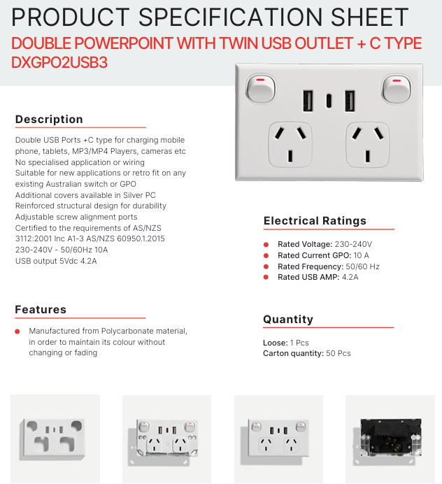 The DXGPO2USB3 is the perfect combination of power and practicality. Equipped with dual USB ports and a Type-C outlet, it allows effortless charging of mobile phones, tablets, cameras, MP3/MP4 players and more—without the need for bulky adapters.
