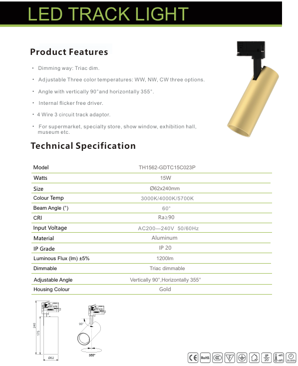 With Trick dimming and an internal flicker-free driver, this track light ensures smooth brightness control and visual comfort. The adjustable head allows 90° vertical and 355° horizontal rotation, offering maximum flexibility for targeted lighting.