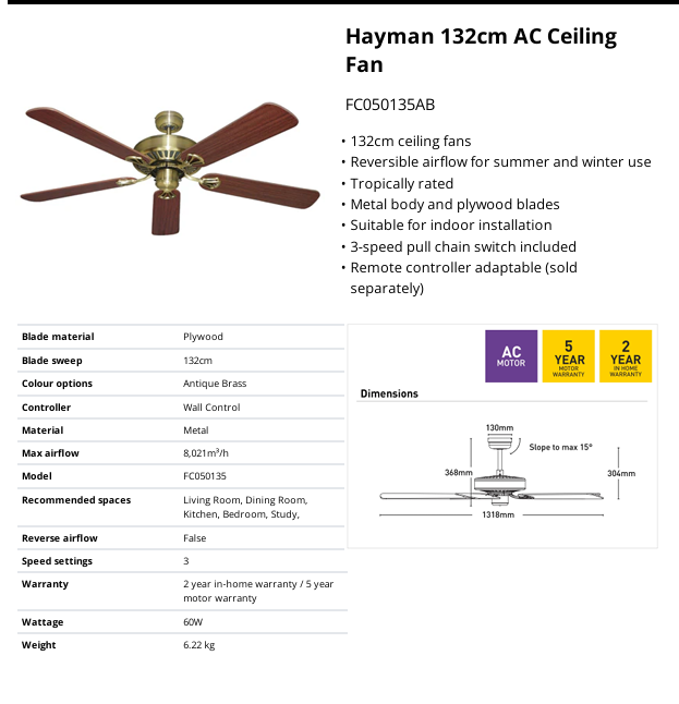 Enjoy superior airflow and timeless design with the 132cm Ceiling Fan — a dependable and stylish solution for your indoor comfort needs
