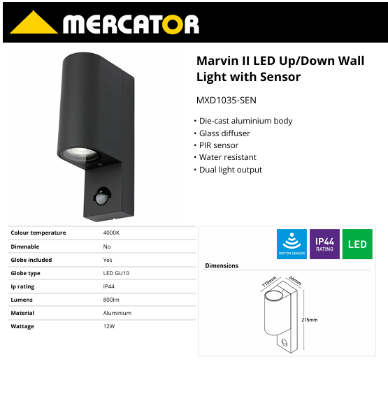 The Marvin II LED Up/Down Wall Light with Sensor is a stylish and practical outdoor lighting solution designed to enhance both security and appearance around your home. Featuring a modern up and down lighting design, this fixture creates a beautiful architectural lighting effect on exterior walls while providing reliable illumination for entryways, pathways, patios, and garages.
