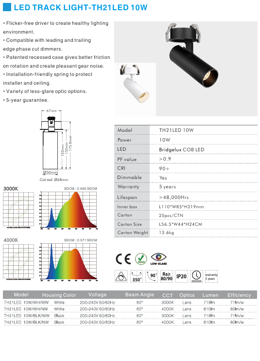 The 3A TH21LED 10W combines the modern look of a track light with the simplicity of a downlight installation. Designed for projects where you want the stylish, adjustable appearance of track lighting — without the hassle of installing a full track system — this fitting is the perfect solution.