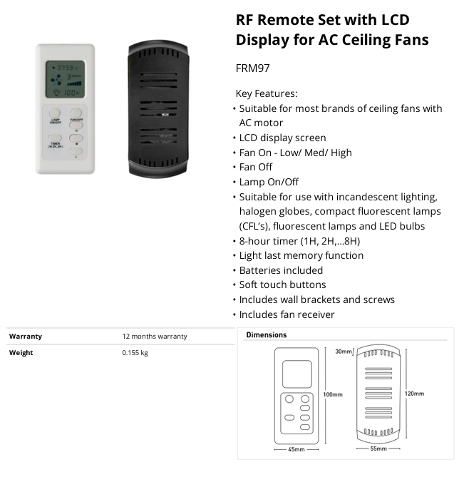Upgrade your ceiling fan with the FRM97 RF Remote Set, designed for ultimate comfort, convenience, and style. Featuring a sleek LCD display, soft-touch buttons, and 8-hour timer, this remote set gives you total control of your fan and light functions — all at your fingertips.